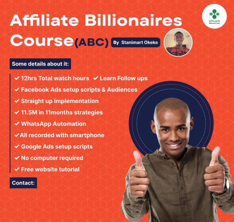 You’ll be added to our mentorship forum called Affiliate Billionaires.Here, ideas and strategies that will help you achieve your set goals are given. You can as well ask your questions here.For you to move fast in sales as an Affiliate, A Blueprint which is a straight up training on what you really need to be doing as an Affiliate has been created just for you!This Blueprint is called the Affiliate Billionaires Course (ABC)Just as this name "ABC", It's the easiest affiliate marketing training you can take today. No long stories. No beating about the bush! No too complex details.It's as easy as ABC!Should you want to master website designing using our own skills, A course on How to design a landing page using Elementor will be given to you FOR FREE if you're starting TODAY.Then to increase your internet marketing knowledge, 19 Internet marketing eBooks will be given to you FOR FREE IF you're ready TODAY.Again, to make your activities as an Affiliate marketer very stress free, a premium WhatsApp Auto responder will be given to you FOR FREE. If you check on Playstore, you'll see what this cost yearly. But you'll have access to it for free for a lifetime.I know you might be a novice when it comes to internet marketing, so you may not have some words to use to communicate your products, don't worry.You're in the hands of pro internet marketers. You’ll have access to ready-to-use scripts that have generated over 12M in one year.Again, one of the tools we use as Affiliate marketers is websites. This may cost money to get. Buh in a case where you don't have the finances to get 1 for yourself, you’ll learn how to get a website without spending 1kobo.Also, people who buy digital courses on the internet have been researched on. So you’ll be having access to the audience to use for your Facebook targeting. Be 100% guaranteed that these are audiences that will buy your product.Finally, you'll give you access to a training on how to appear on Google when people search about your product.This is called Google Ads and you'll be able to learn and implement this using just your smartphone. Plus Access to YouTube marketing.So are you ready for this journey as an Affiliate Billionaire? They're all about you. I'm ready to help you succeed. Are you ready?If YES, Then Affiliate Billionaires Course(ABC) is all you need, to access all these and get access to lifetime training/mentorship.