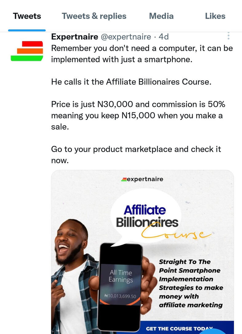 Why This Course On Affiliate Marketing?The major way an affiliate marketer makes money is when he/she records a sale.So, in a case you don’t have any idea at all on how to reach people who gonna buy, how will a sale be made?At this point, one may start saying the business isn’t working because no sale is coming.This particular barrier is what we’re solving with the Affiliate Billionaires Course(ABC) on Expertnaire Affiliate marketing program.We don’t just allow you become an affiliate, we’re interested in seeing you succeed hence why a training is provided for you.With this training, IT IS NOT POSSIBLE for you not to record a sale. Even in your first week of implementation.I’ve gone through it. So I know what I’m talking about.